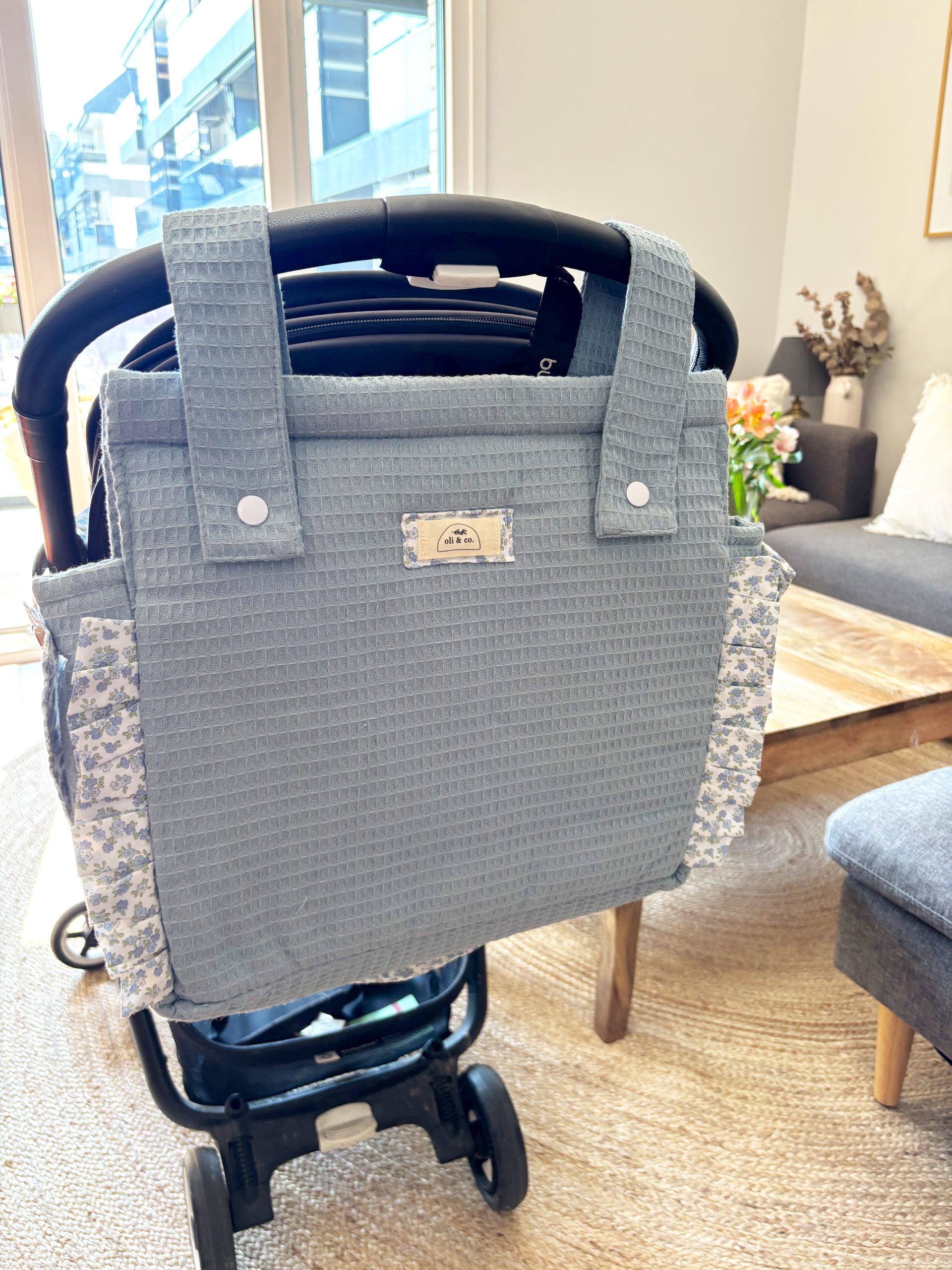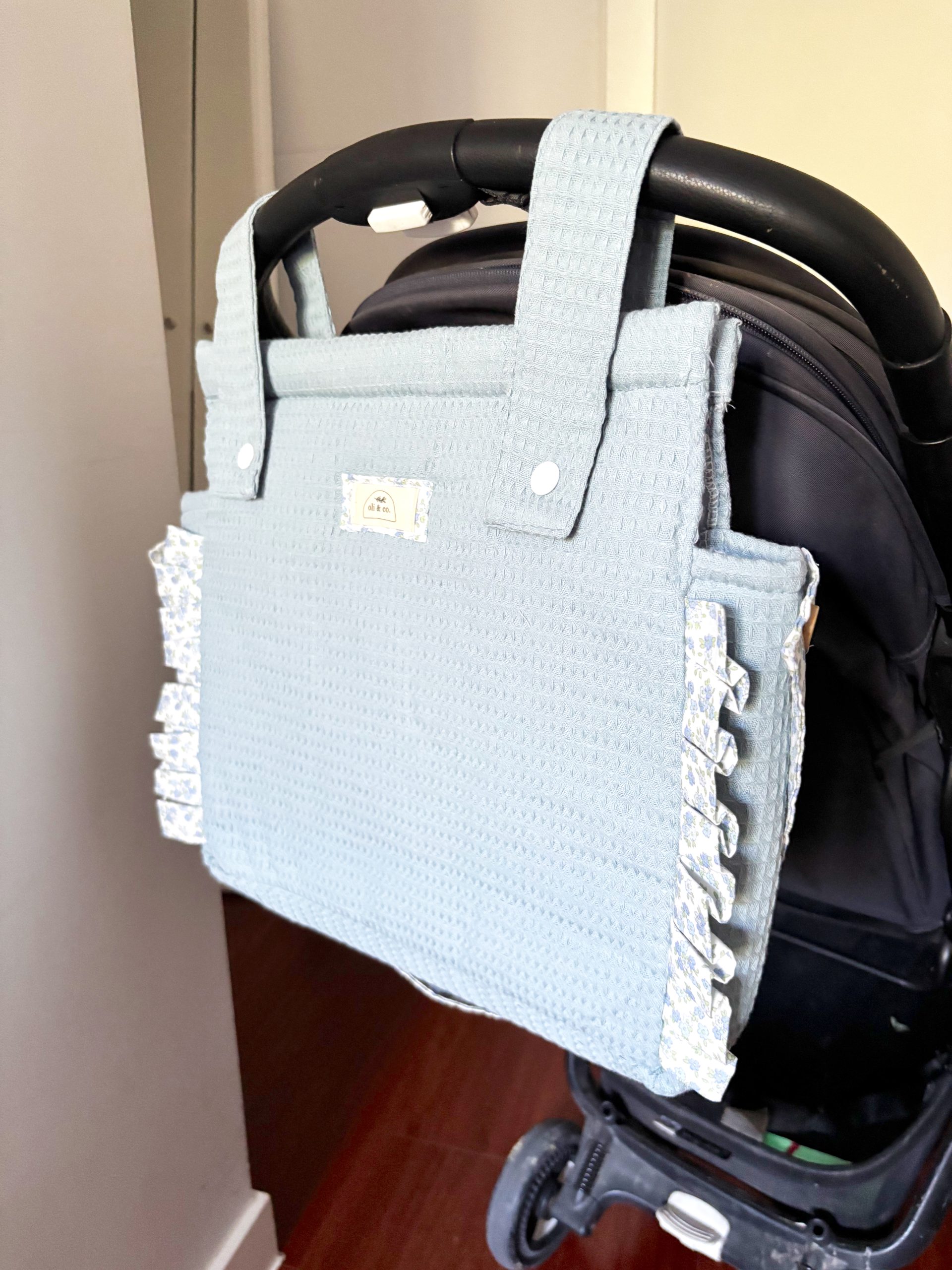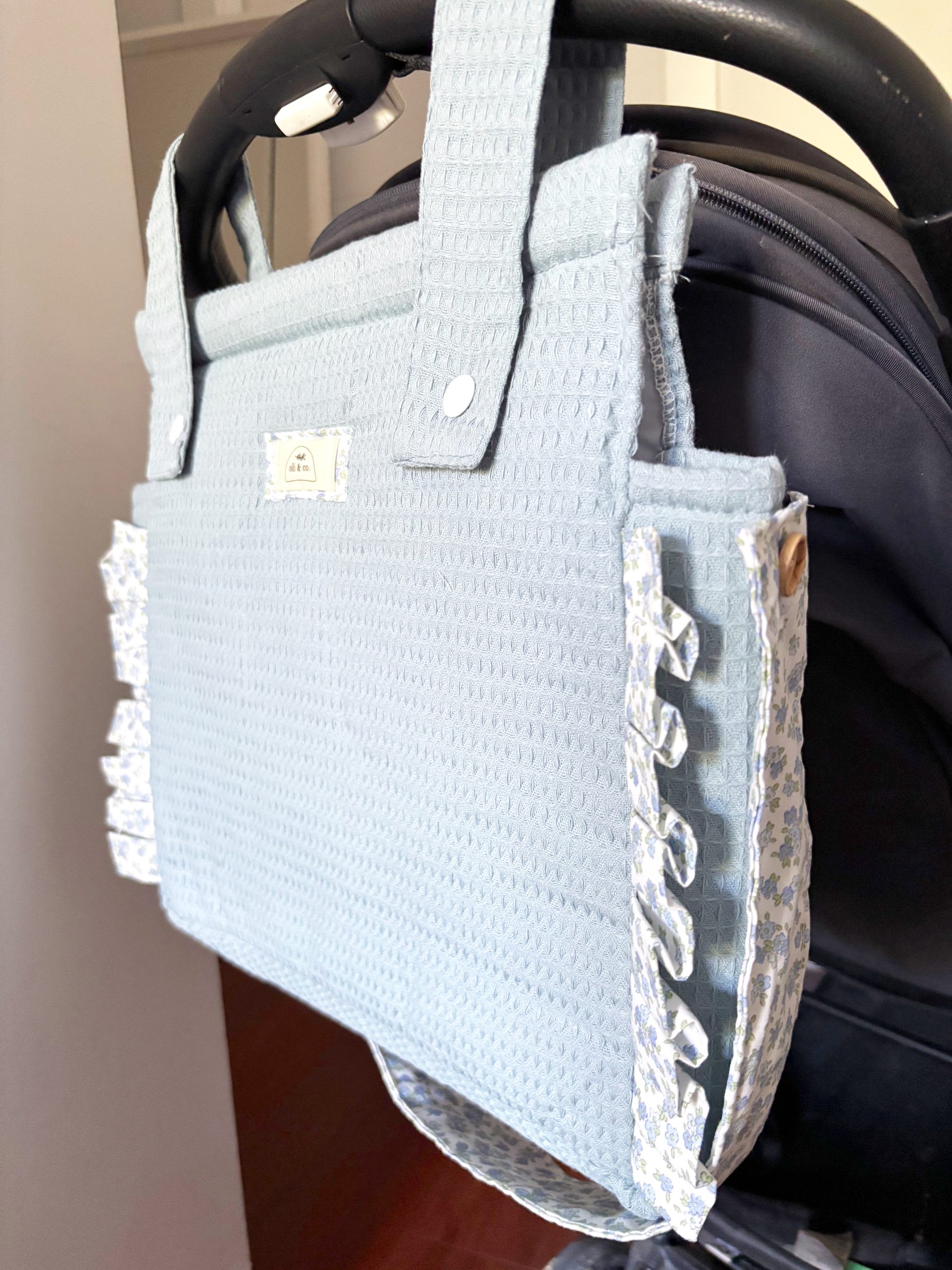 Bolso waffle azul con volantes laterales y asa de hombro en flor azucena