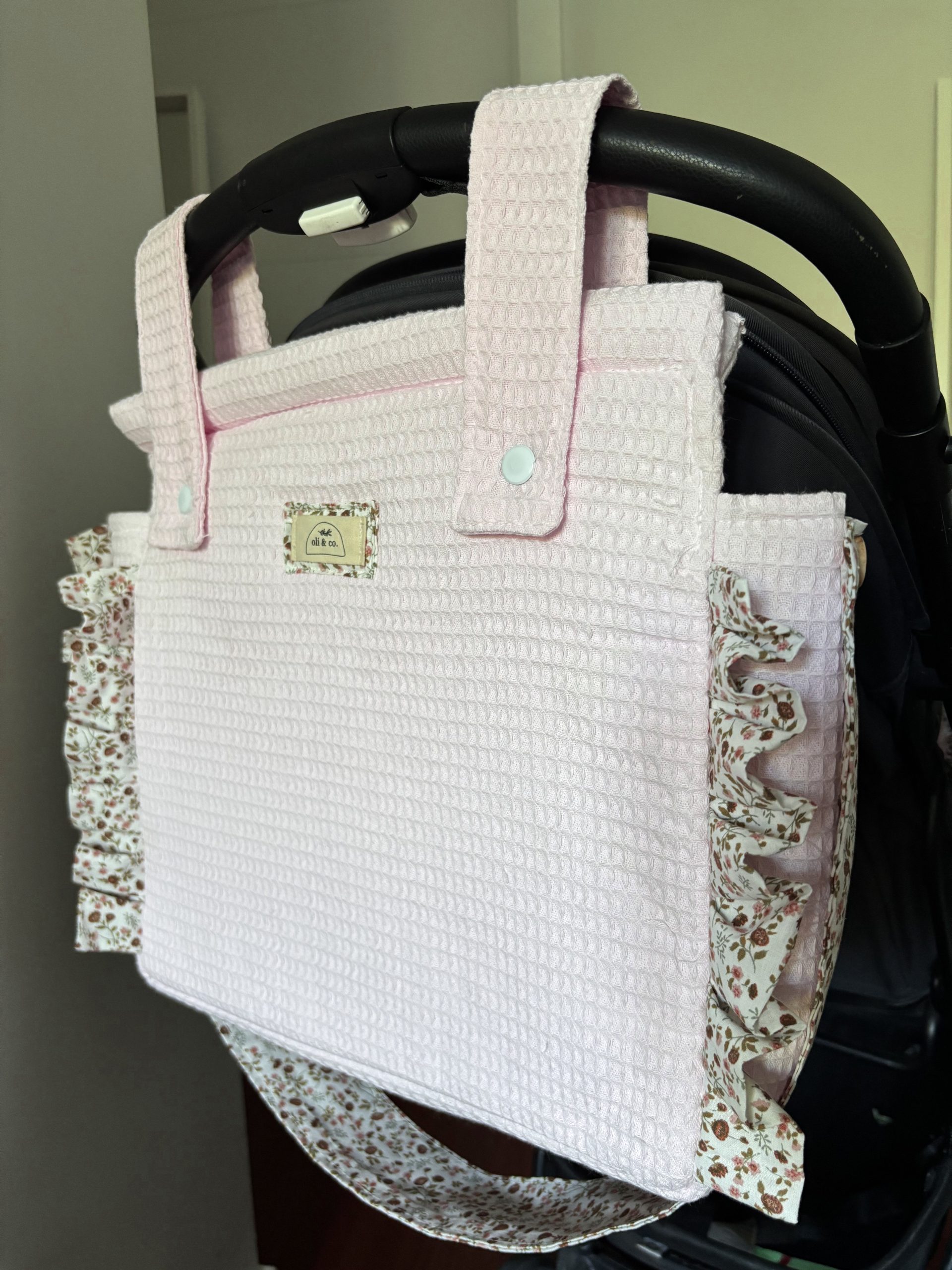 Bolso waffle rosa con volantitos y asa de hombro Eva