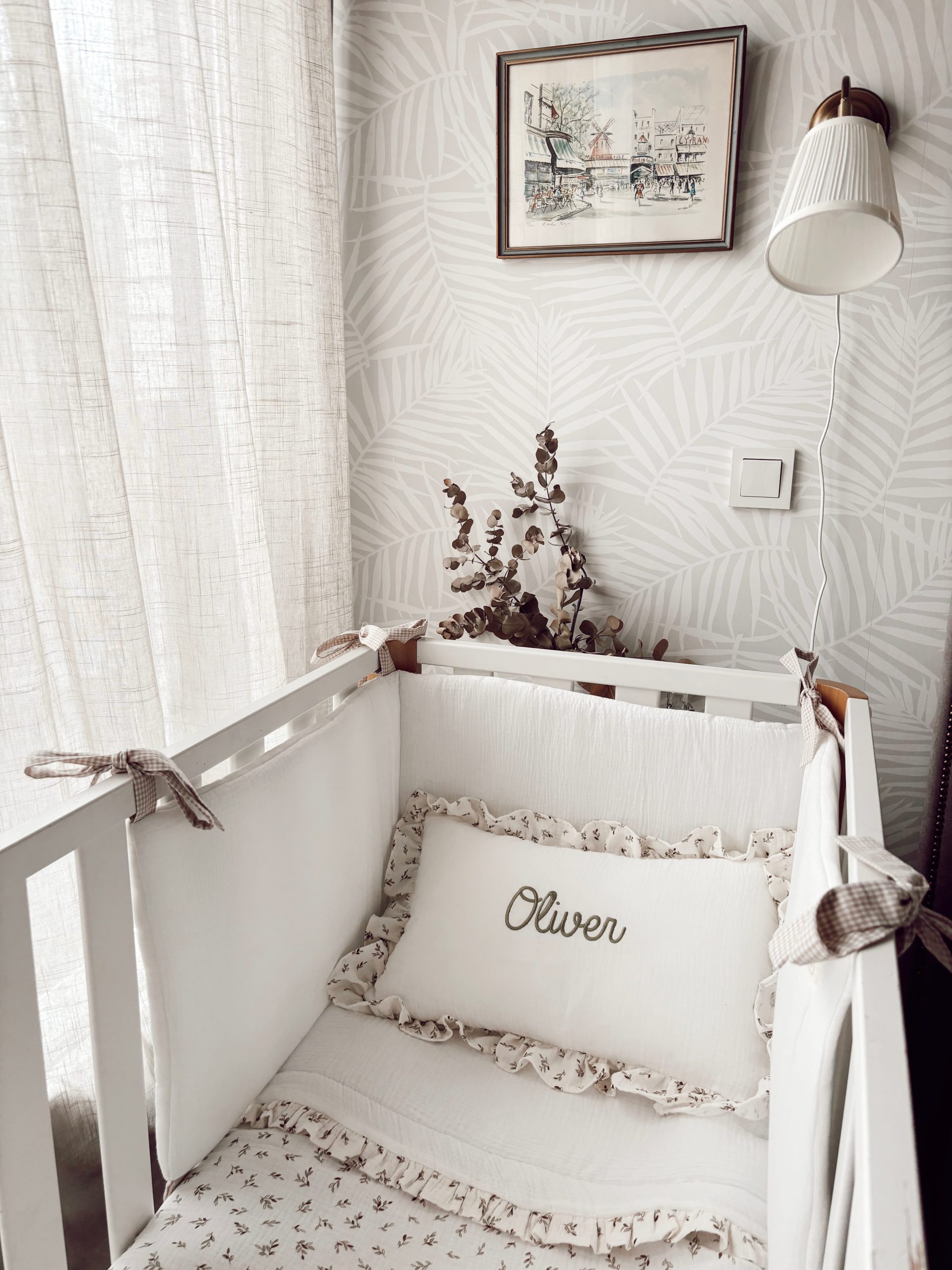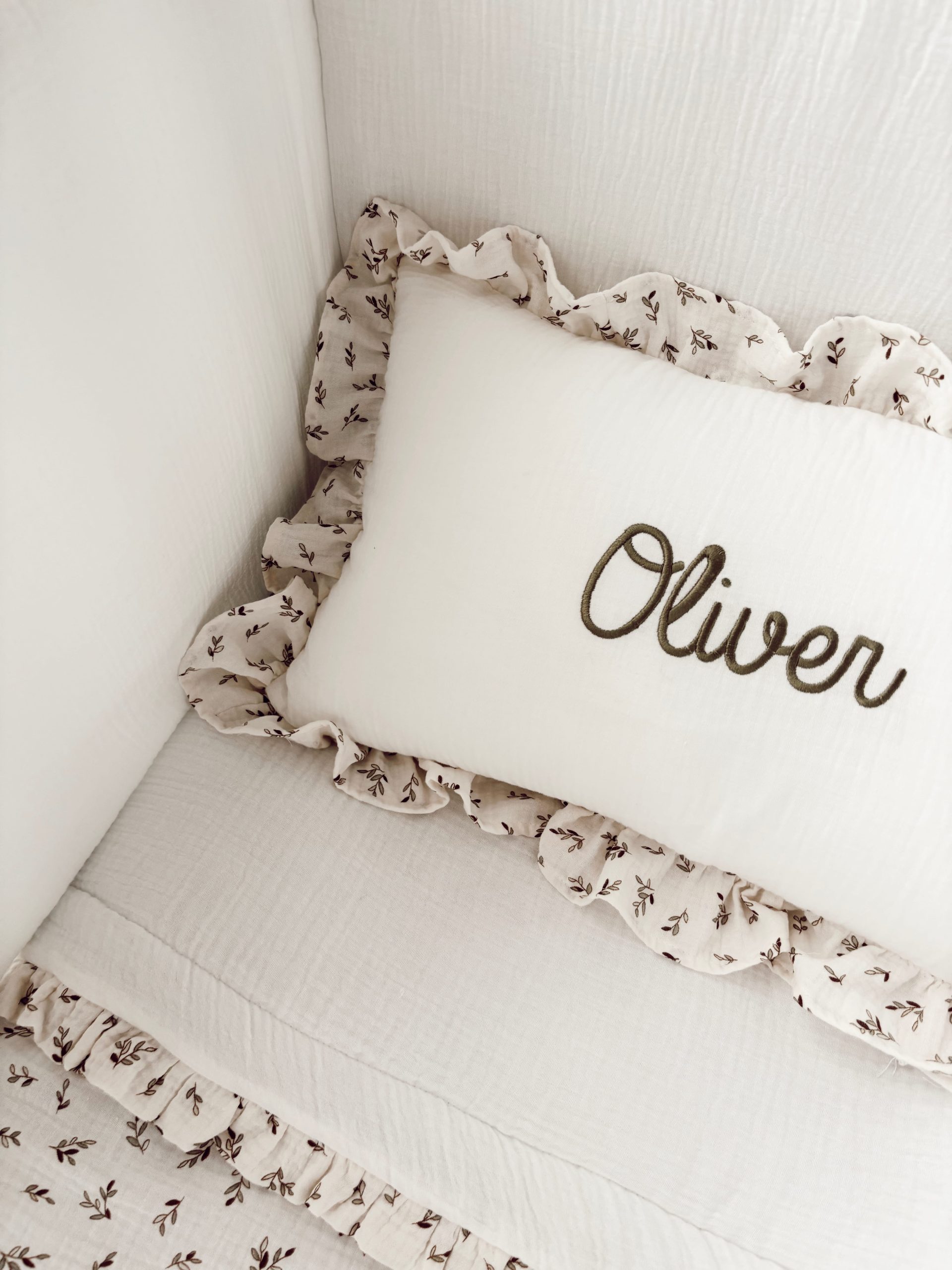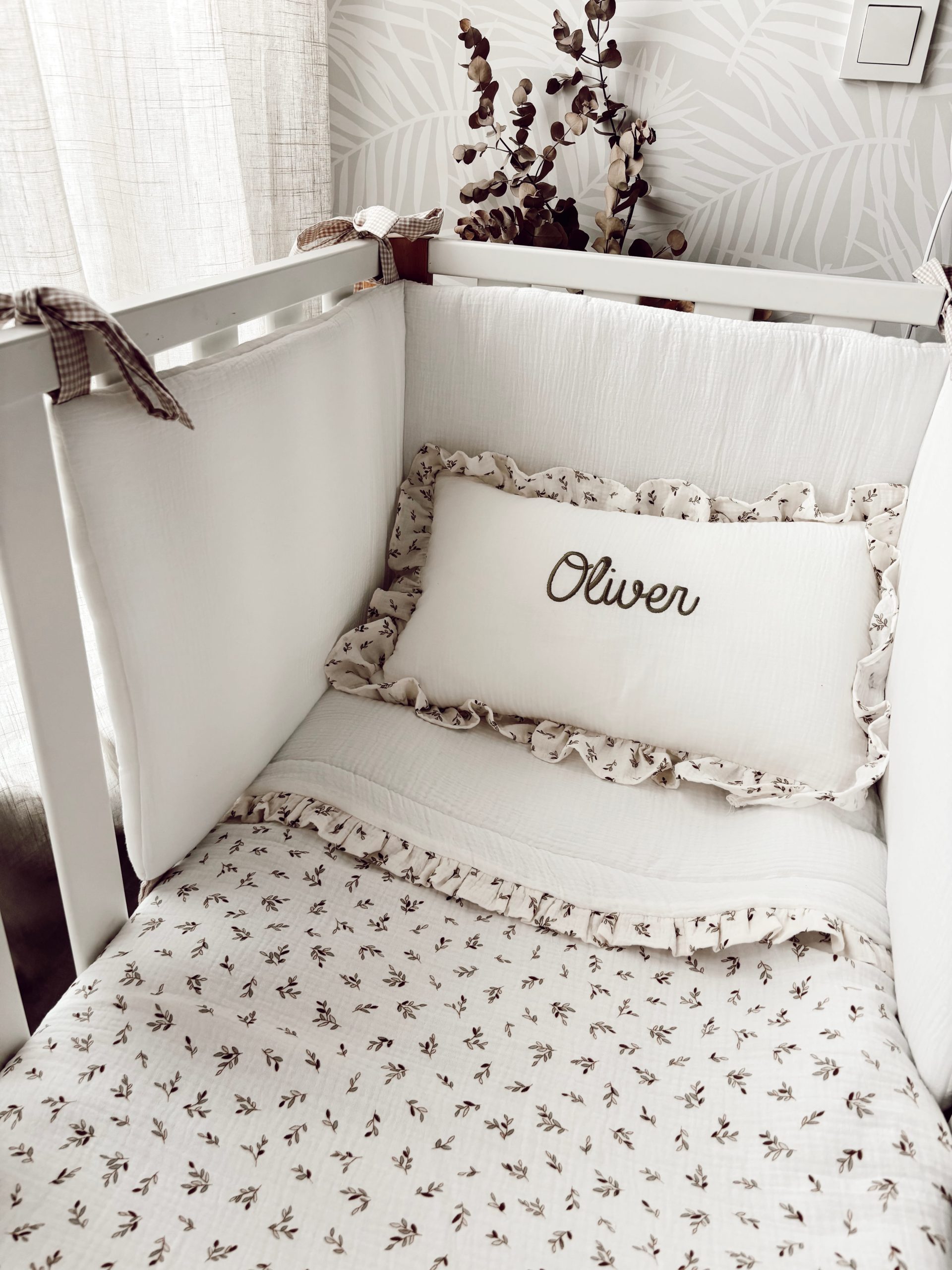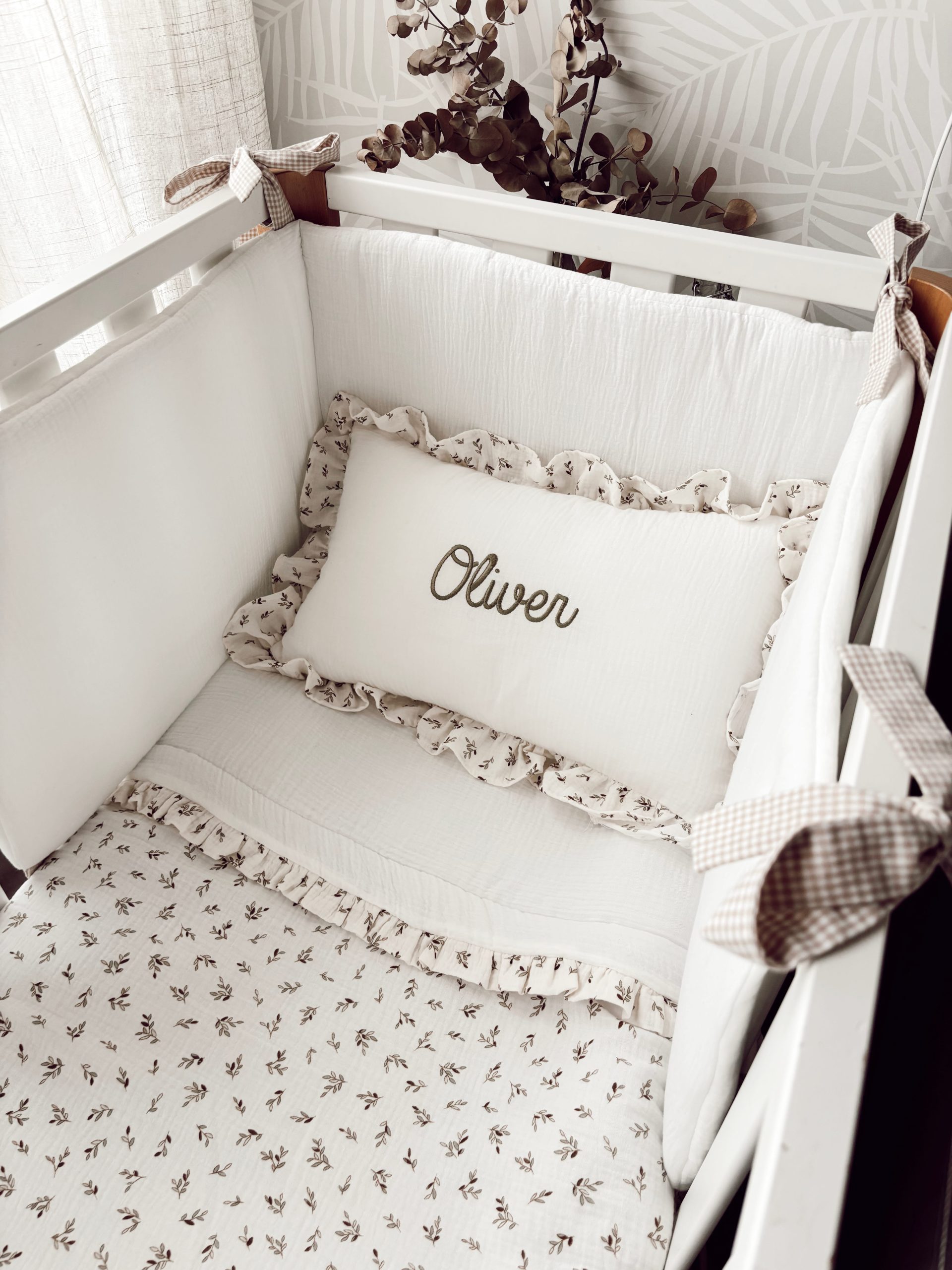 Conjunto de cuna de edredón, chichonera y cojín con volantitos