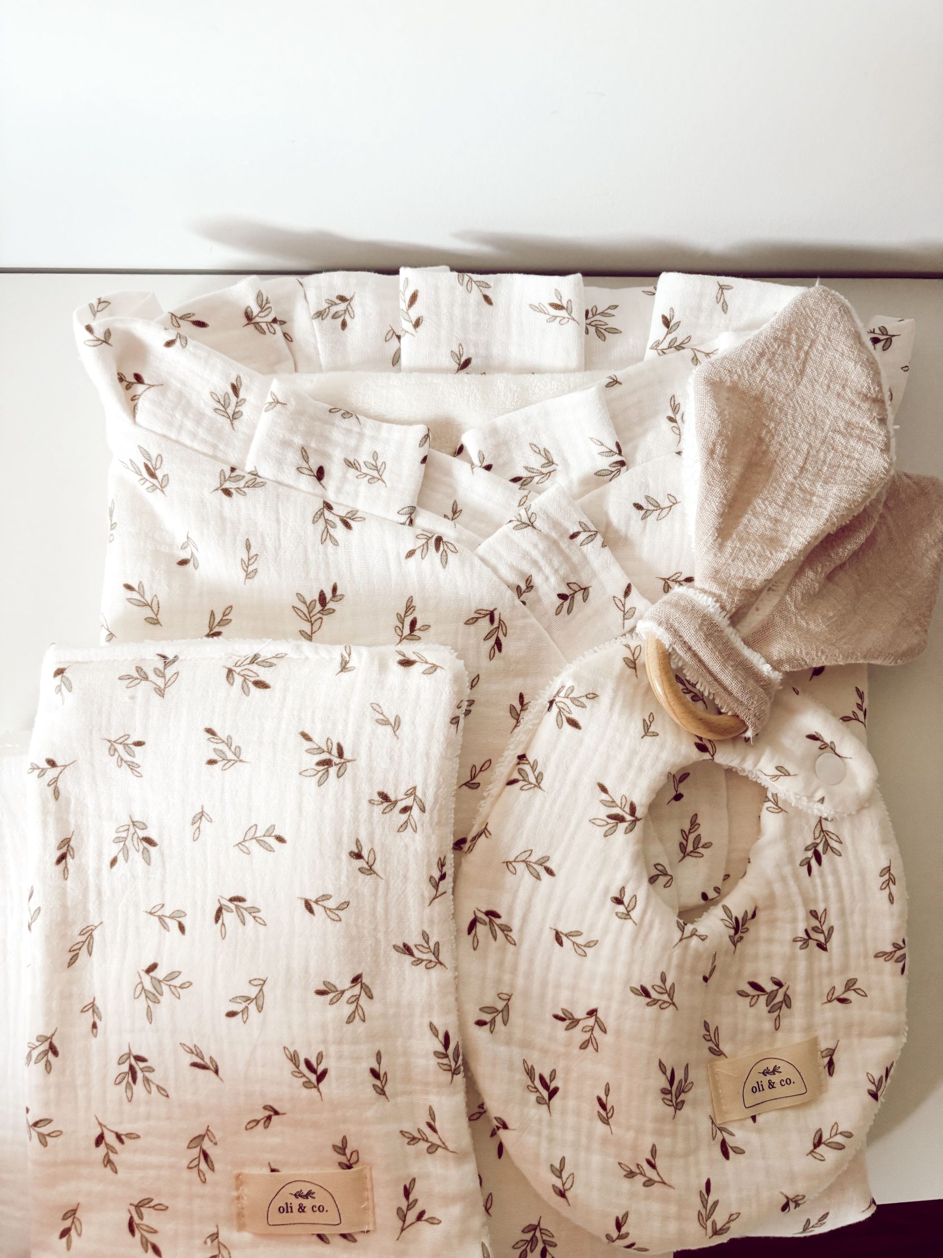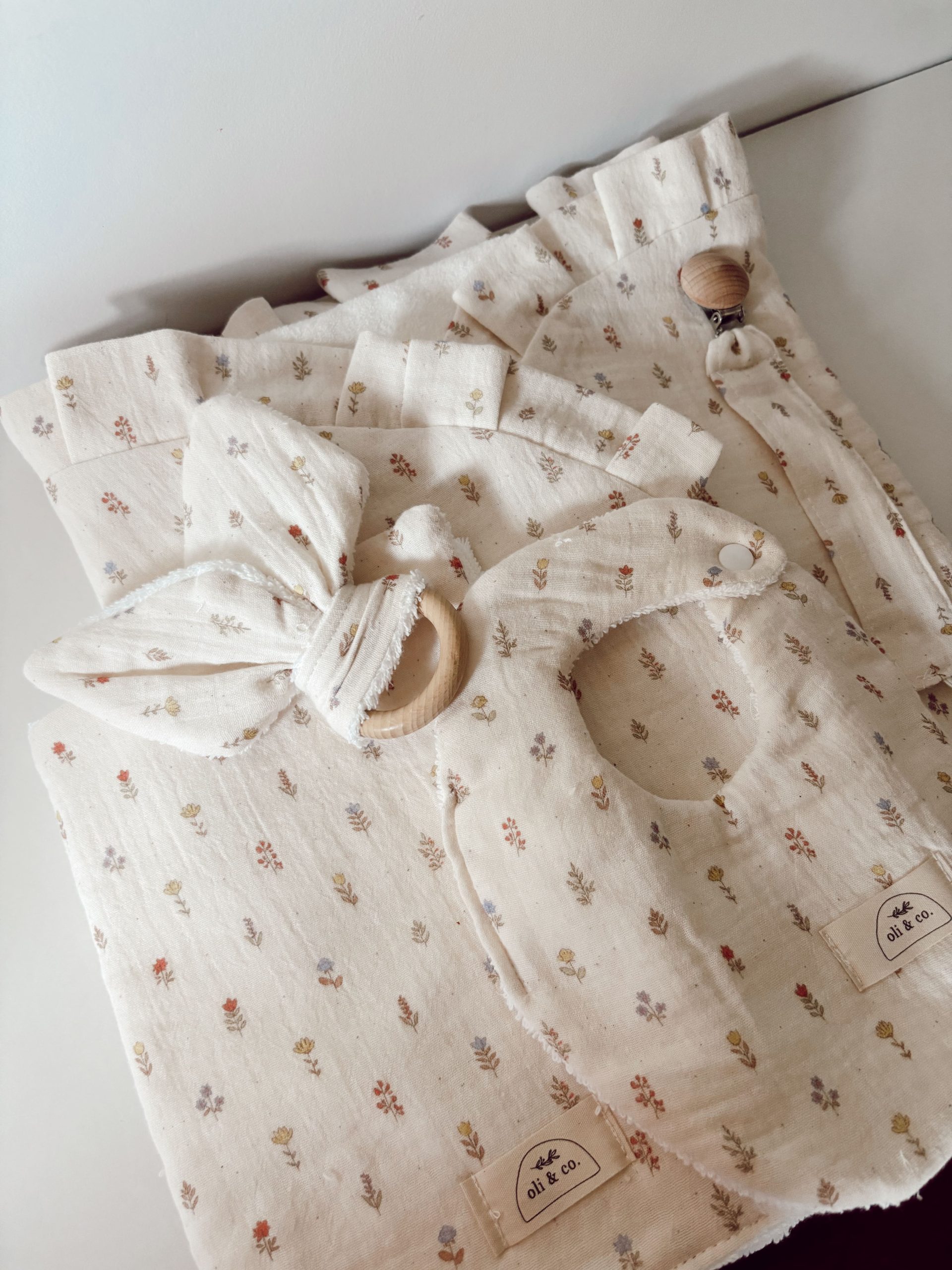 Pack regalo para bebés con arrullo+babero+chupetero+mordedor en tela muselina