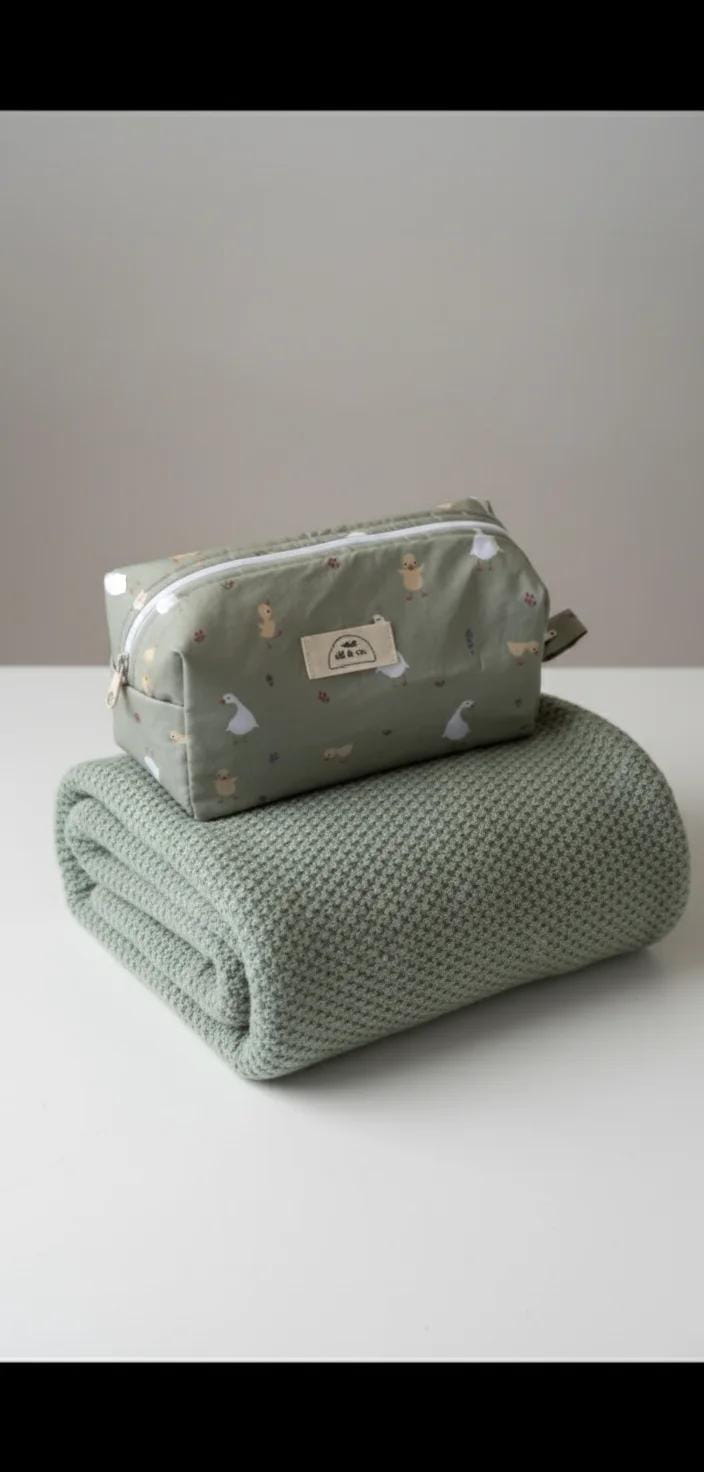 Combinación ideal y económica de mantita de lana y neceser grande.