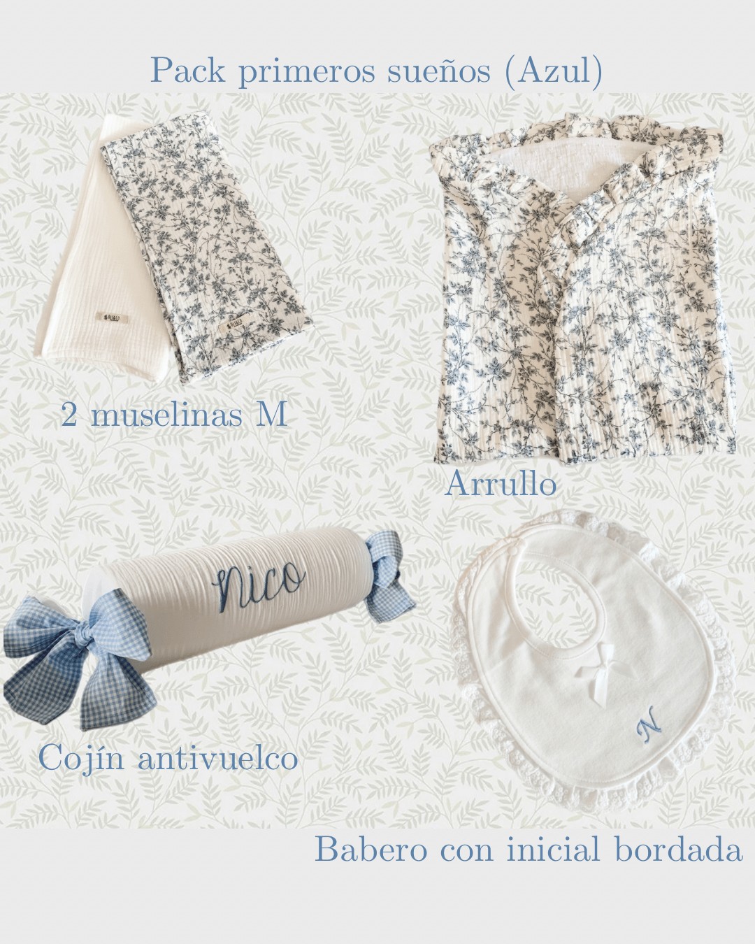 Un cojín anti vuelco, para colocar al bebé en la posición más cómoda después de comer y evitar reflujos. Y un babero de algodón 100%, delicado y suave con su inicial bordada en azul empolvado.