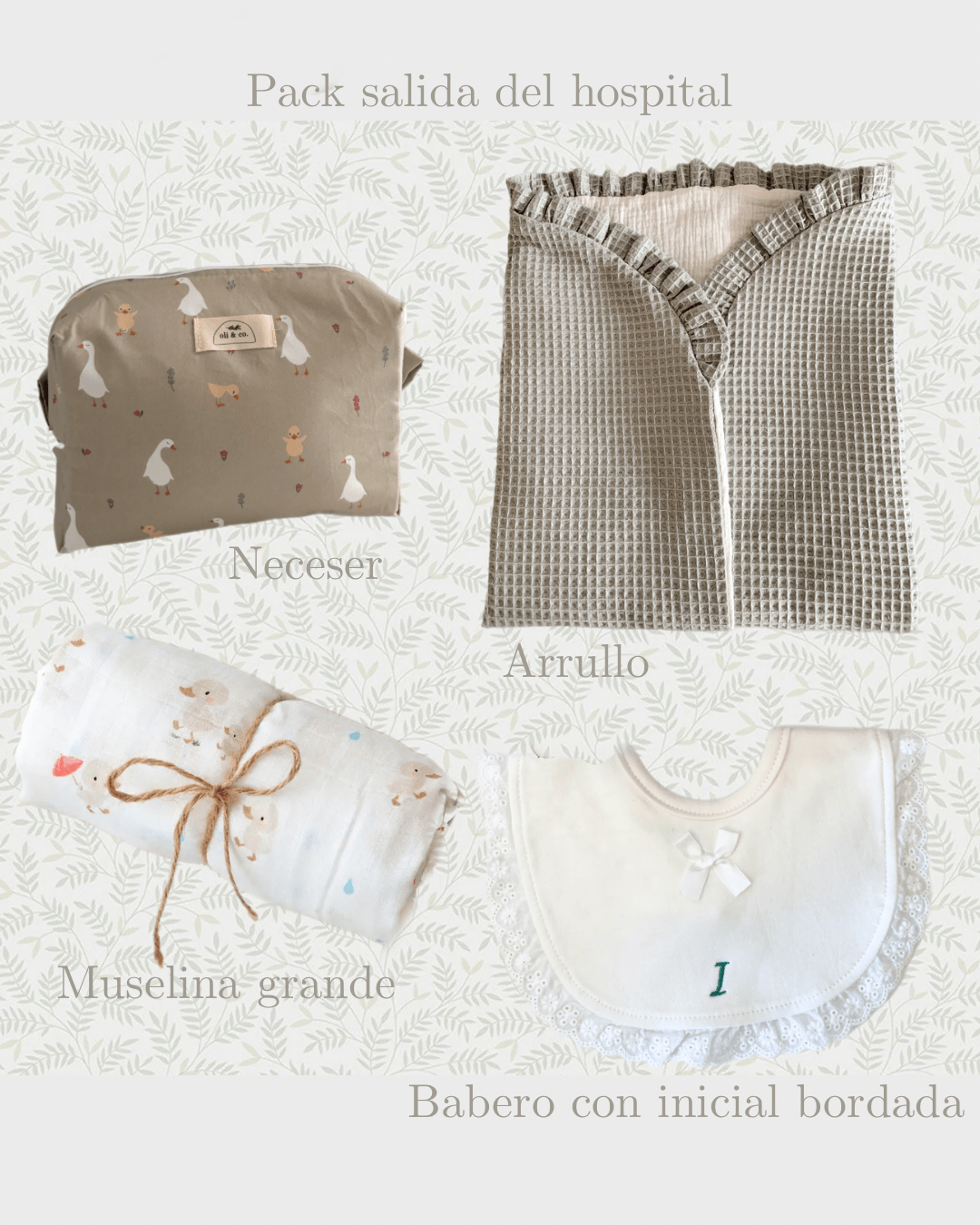 Se compone del 1 neceser con gran capacidad, un producto fundamental para padres y madres, una muselina grande que es uno de los productos más versátiles del mundo “bebés”, un arrullo que siempre es un imprescindible los primeros meses del bebé para arroparle, fabricado con materiales 100% seguros con certificaciones de calidad, ya que en contacto con la piel del recién nacido es fundamental un buen material.
