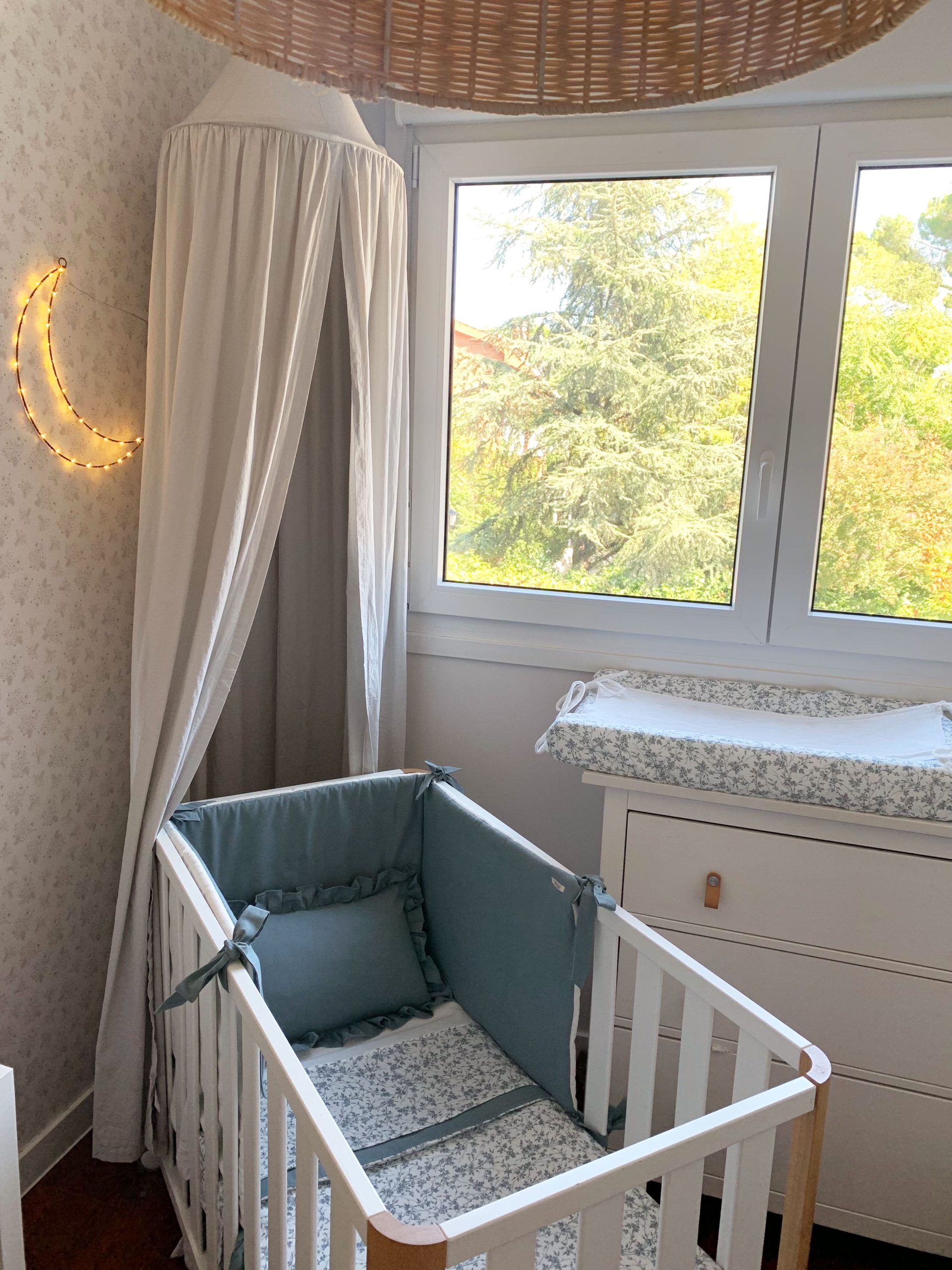 Cuna: Chichonera, edredón, juego de sábanas, cojín bordado con su nombre, manta fina para media estación y verano, organizador de cuna.